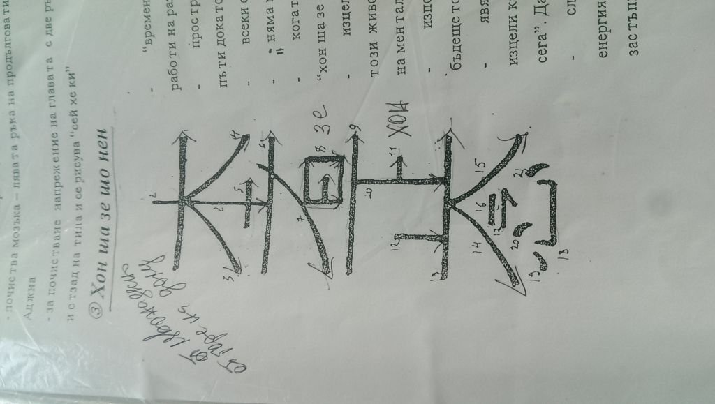 Здравейте, имам нужда от символа хон-ша-зе-що-нен. Забравила съм последната му част, а ми трябва спешно. Моля ви, ако някой е карал курс в Български рейки център и може, да ми го нарисува. Търсих в интернет, но намирам символа изписан по съвсем различен начин. Благодаря ви предварително.