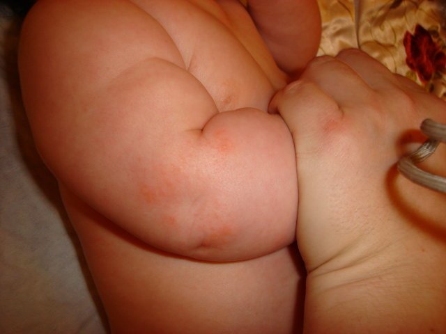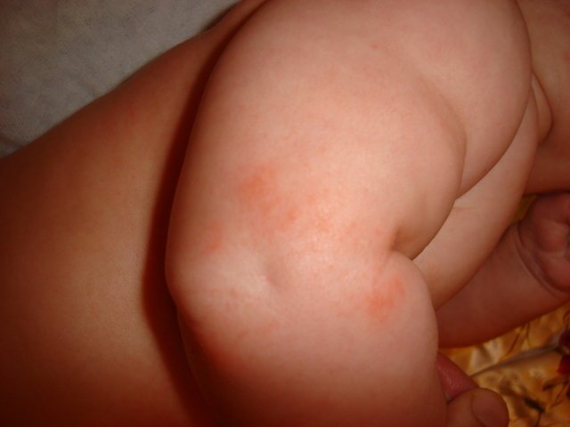 да ви покажа още две снимки,това е на ръчичката ,като и на двата лакътя има,тази вечер като я къпахме забелязах че след банята станаха всички по -червени.На някой места не са като пъпки,а на други като пъпки.
