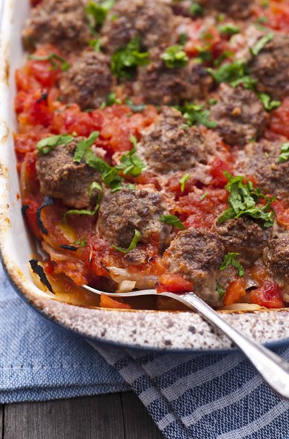От снощи - много лесни телешки кюфтенца в доматен сос с карамелизиран лук