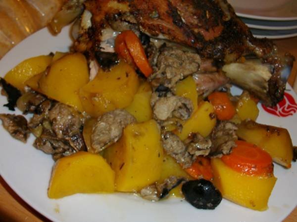 Яхнията се подправя с червен пипер, черен пипер и се посолява.