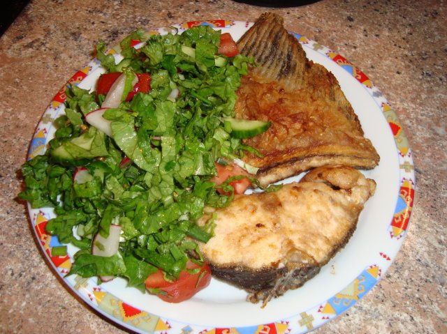 У нас днес пържени калкан и морска лястовица със зелена салатка, хлебче -аламинут с грис, бяло и грахам брашно и  тиква с прясно мляко.