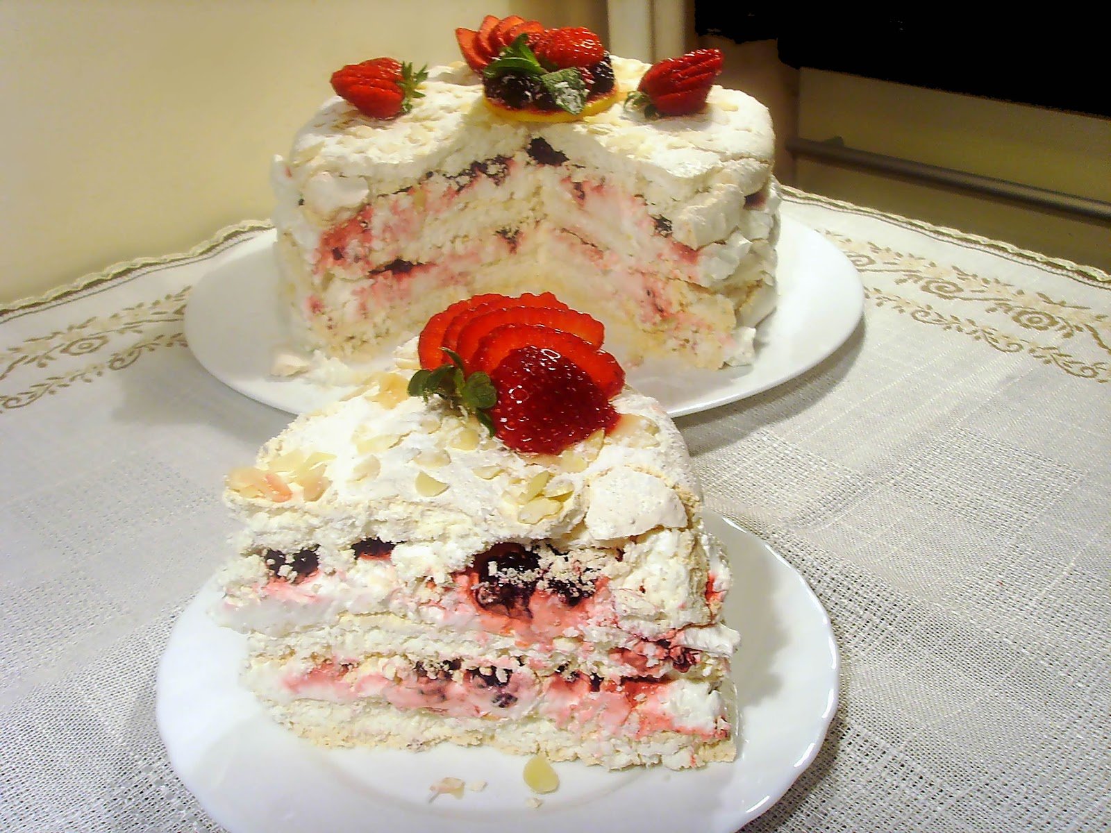 Аз само пак на бегом да си покажа една бърза и Wink мнооооооооооооого вкусна Торта от целувки с бадеми и къпини