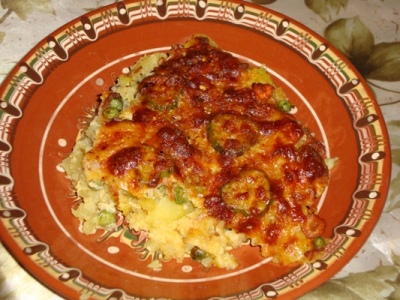 Запеканката е в стил "Почисти хладилник".Има варени лартофи,зелен боб,пуешко филе,лук,манатарки(малко).Заливам със смес от 1 майонеза и 1 кисело мляко+малко синьо сирене(понеже имах).