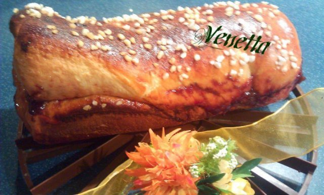 а другият е с пълнеж от мармалад от сини сливи и орехи. Не затворих добре краищата, и мармалада излезе навън, но въпреки това  козунака бухна много и съм доволна от резултата. Като го пипна е добре.