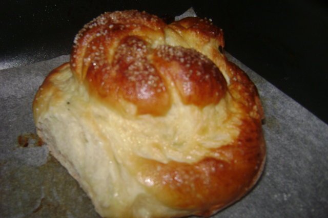 Благодаря, аз като една абсолютно начинаеща..... Рецептата е на Венета, само дибавих ванилия и лимонови кори. Но този път изчаках захарта хубаво да се стопи в яйцата, отделих малко от брашното и го добавих при млякото и маята, изчаках го около 20тина минути да шупне и го прибавих към останалите съставки. Използвах суха мая. Не знам дали всичко това има значение но тестото ми се получи, втаса хубаво и го усуках няколко пъти. Peace