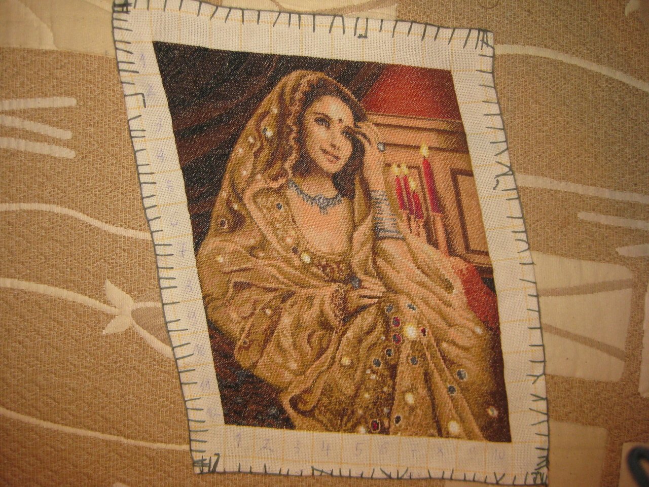 Моята индийка е тази-но незнам в каква рамка да я сложа,защото повечето рамки на другите ми гоблени са златисти или кафеви....А ми адски трудно ,когато се стигне до рамка-за това някои ми стоят така....в шкафа....