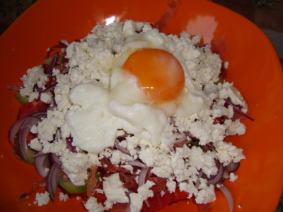 В нас една Великденска салатка ( така съм си я кръстила) и една много нездравословна вечеря от бланширани пържени картофки и печени панирани сиренца ( полуфабрикат) наготово и набързо.