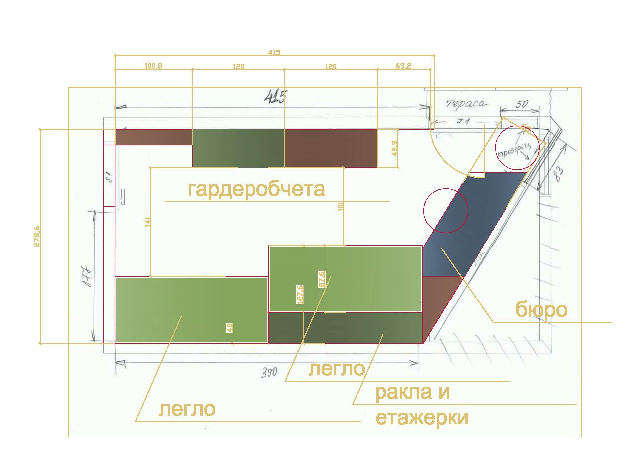 Слагам ви гардеробчета по 120 см, изтеглям едното легло напред - зад него ракла и нагоре може малки шкафчета. Разгледайте. Добавям и бюро. Наистина е комплицирано, предполагам има и други варианти. Този ми хрумна като най-адекватен на пръв поглед.