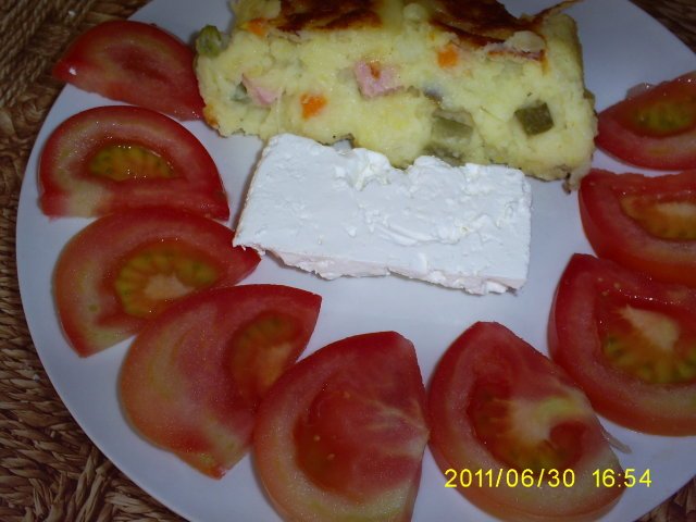 Плънката: пак днешната - 4 по-големи моркова, настъргани на едрото ренде, задушени в олио с много мааалко водичка. А може и без вода под капак. Като станат готови, слагам 3-4 скилидки чесън, пасирани с онова приспособление за мачкане на чесън, разбърквам и оставам да изстине. После слагам една майонеза, разбърквам сместа хубаво, може да се посоли при нужда и редя тортата – блат, смес и така до края. Най-отгоре и отстрани намазвам със сместа, украсата както дойде. Хубаво е да постои поне час в хладилника, не пречи и повече. Плънката може да бъде и друга – от варени яйца, пържени гъби и каквото се сетиш. Днешното торте беше с 5 блата в голяма чиния. Харесва ми, вкусно е. Peace