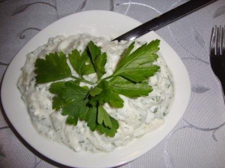 Салата/разядка от печен лук със свежи подправки и цедено мляко