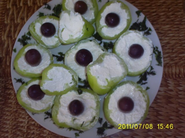 Ние днес дояждаме пържолките , но към тях  доматена салатка и едни много вкусни хрупкави пиперки с ароматно чесново сирене + заквасена сметана.