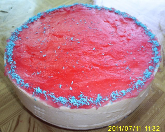 Разбива се останалата сметана и към нея се добавя крема. Разбърква се добре. Разтопява се и втория желатин и се добавя към вече готовия крем  за да се получи по-голяма стабилност.