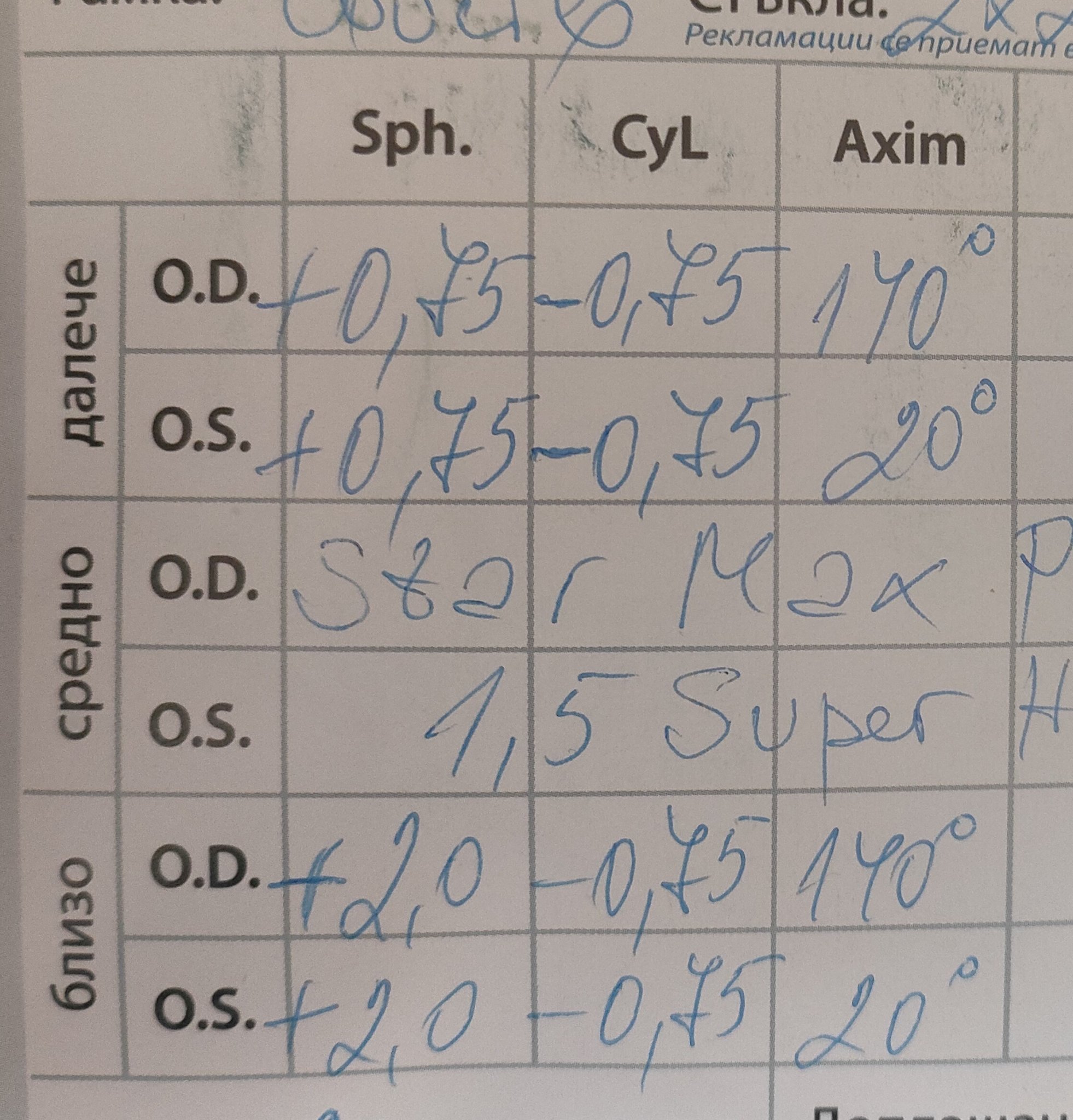 Стойностите в рецептата за очила, като например -0,75 и 105°, показват диоптър и ъгъл на астигматизма. Тези стойности се използват за коригиране на астигматизъм и късогледство. Диоптърът показва степента на необходимата корекция, докато ъгълът на астигматизма показва посоката, в която трябва да бъде поставена корекцията в очилата.
