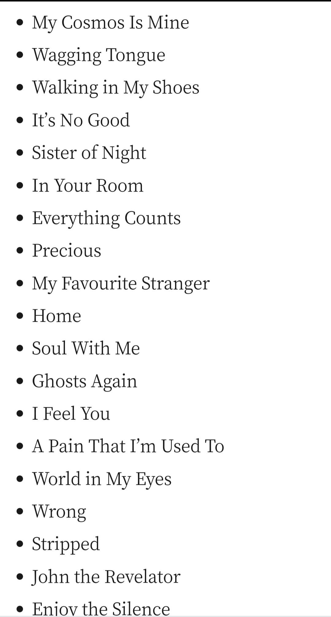 Сетлистът беше същият като в Дюселдорф,  който постнах по-назад. По време на World in my eyes беше отдадена трогателна визуална почит към Анди, която направо ме стисна за гърлото, а вярвам не само мен.
