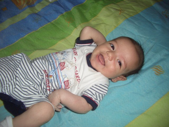 И ние сме будни от 6 часа, ама диването не ме остави да се включа. Изака се Дани  стабилно (както казва баща му изкара пиянското от снощи), измихме дупето и толкова беше доволен, че даже не се разсърди, че му чистих носа. Голяма игра падна по голо дупе на повивалника. Говори ми, смя се, рита, по коремче го обръщах, вдига главата, голяма радост,а татко му проспа всичко. Ама много срамежливо моето дете, тези представления ми ги прави по цял ден като сме самички, но има ли още някой само седи и се пули #Shocked . Ако ще и на маймуни да му се правят, той е железен.