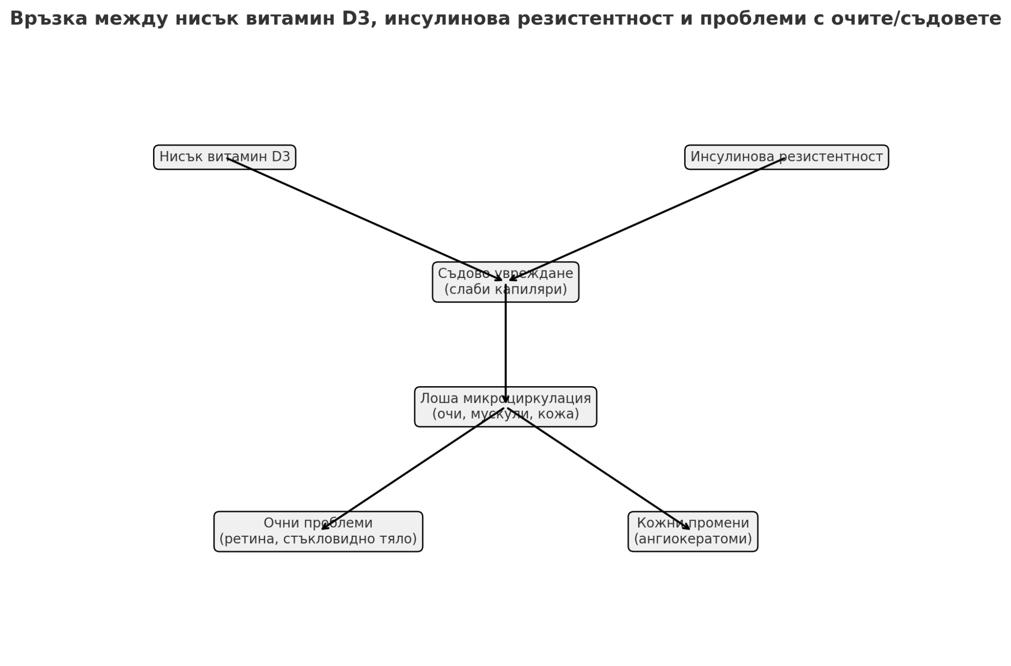 Много нисък витамин D3 дълго време → подкопана здравина на капилярите, по-слаб ендотел.