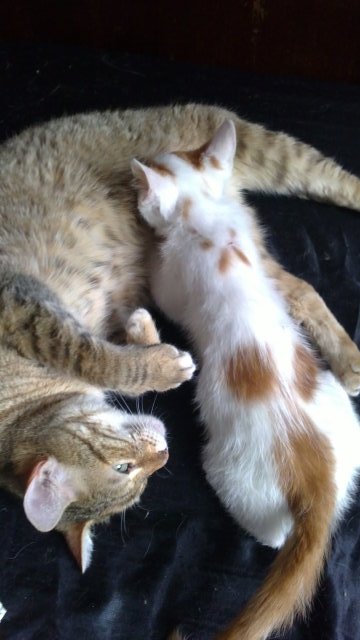 Лежа си аз, тракам си на компа и изведнъж чувам оглушително млещене до мен. Какво да видя - Сикозу мие малкото а то се опитва да суче от нея LaughingМила картинка - а до вчера му се зъбеше. И много интересно му говори - почти като на птичките, но не съвсем - едно "ка!",  "ка!", което никога досега не съм чувала.