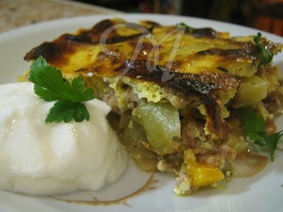 Брашното, бакпулвера и яйцата се разбъркват, постепенно се добавят млякото и зехтинът. Накрая се добавят месото, кашкавалът, магданозът и подправките. изсипва се в намаслена формичка и се пече на 180 С около 45 минути. Сервира се студен.