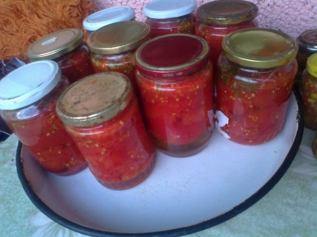 Доматена манджасупер:Доматите се мелят с машинка,запържвам повече лук и изсипвам смлените домати при лука да поизврът,малко патладжан също опечен и смлян,червен пипер,зелени или червени чушки опечени,обелени и нарязани на парченца..След като домата поизври слагам нарязаните чушки и бъркам около 5-10 минути.Махам от огъня и на вкус слагам сол,захар,магданоз.Пълня бурканите и стерелизирам за 30 мин.Става страхотна направо да си оближеш пръстите.