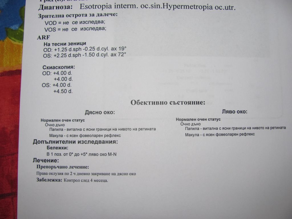 Заведохме я и при друг лекар за второ мнение, който отново разшири зениците и постави следната диагноза:" Конвергентен конкомитентен страбизъм", Придружаващи заболявания: "Хиперметропия", Анамнеза: криви ляво око навътре, Обективно състояние: Vis-не се изследва ( поема фиксация с всяко око ); 1-2 до +10 с л.о. ; С.Т. (+) ; M-N ; Skia: +5(+4.5)/+5(+4.5)-неспикойна. Очни дъна б.о. Терапия: очила; контрол и оценка за оклузия. Очилата, които са изписани са: o.d +2.5, o.s. +2.5, Dp mm 48. При първия преглед ни казаха, както се вижда да отидем след 4 мес. и евентулно тогава да се изпишат очила. Искам да Ви попитам какво е  вашето мнение? Дали трабва да се закрива дясното око и да се изчака или трябва веднага да се сложат очила и така изписаните дали са правилни? Какво може да е довело до кривенето на оченцето при положение че досега всичко си беше както трябва или това е вродено? До колко е възможно да се  израстне това далекогледство и как може да се излекува? Какво води до кривене на оченцето? Извинявам се за дългия пост, но въпросите са толкова много.... Предварително Ви благодаря. С уважение: Цветелина Петрова