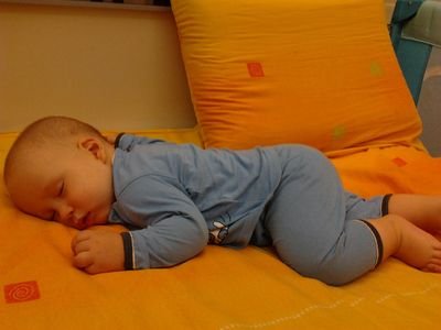 По спомени да отговоря t-ра в стаята 24 градуса,пуснах климатиците вече,за първи път днес мерих температурата на водата,за да се отчета-къпем го на 39 градуса.Нощем спи като на снимката,току що го снимах  Wink боди потник и пижамка,завит с моята завивка.