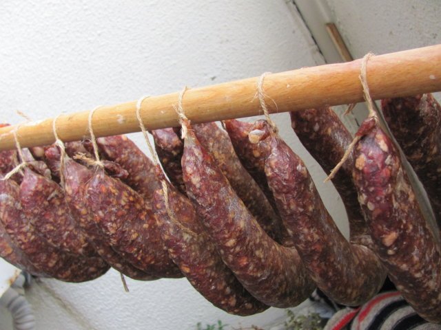 Аз моите винаги от двете страни на напълненото черво правя по една примка за окачване и понякога редувам от кой край да са окачени /Може да се види някъде из първите страници на настоящата тема/