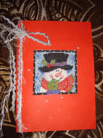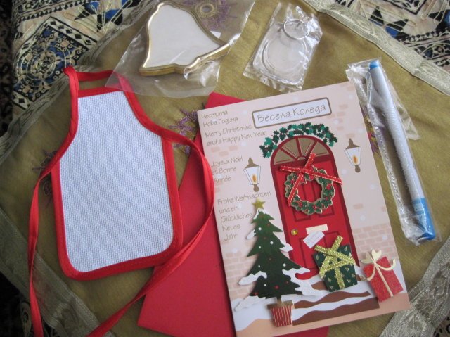 Десиии, благодаря ти за прекрасните подаръци  Hug Толкова са много - два гоблена, престилчица за бутилка, рамка-камбанка, ключодържател, маркер и картичка! Прощавам ти задето не си ми направила картичка, защото тази е много красива  Wink И знаете ли какво имаше в едно от пликчетата? Малко живо паяче, което пуснах в къщи и не снимах   Simple Smile Мисля, че ще ми е на късмет - за цялата идна година  Simple Smile Само да приключа с последната коледна картичка и си започвам подаръците  Simple Smile Обаче, Деска, ще помагаш със схемички за камбанката, престилката и ключодържателя Simple Smile