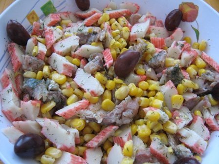 Вкъщи лесна вечеря - готови рибни пръчици, само са изпържени, салатка и стърган сладкиш с лимоново-ябълкова плънка.