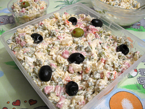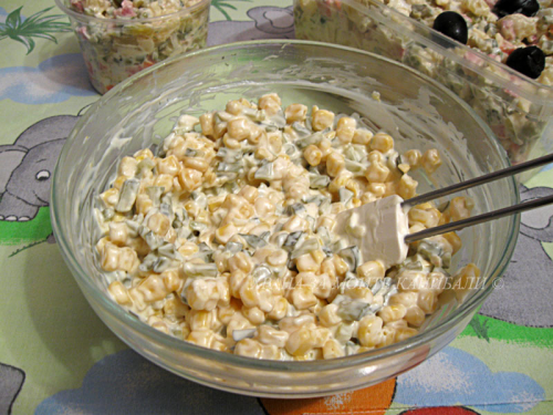от мен две-три салати: млечна,  , руска  и  царевица с кис.краставички и майонеза.
