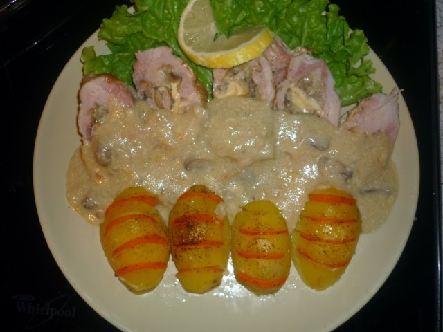 от мен тази вечер млечна салата,картофи,пилешки рула с пълнеж от гъби пушено сирене,чесън лук и сметанов сос със синьо сирене много добре се получиха и торта с моркови  Grinning