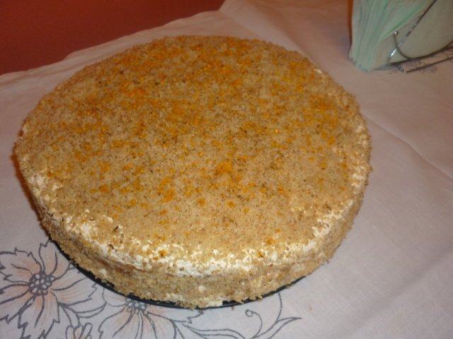 Като се опече, още топло се намазва с мармалада (аз сложих колкото имах ягодов), но имай предвид, че си става сладичко. Разбиват се белтъците на твърд сняг със захарта (не много по-рано, за да не спаднат!) и тази снежна смес са разпределя внимателно с дървена лъжица / шпатула върху мармалада. Посипва се с орехи (аз забравих) Цялата тази красота печем на 130-160 градуса още около 15-30 минути (при мен 20 минути, първите 10 на 160, после на 130 градуса) и това е Simple Smile