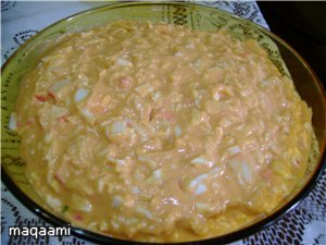 От мен една много интересна салата с фалшиви спагети от ролца от раци. Търпи много вариации, в зависимост от вкусовите предпочитания.