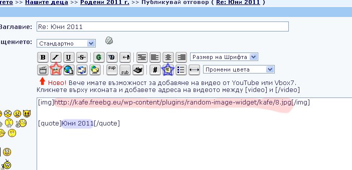 С червеното е за снимка, кликваш иконката и се появяват двата тага, между които трябва да вмъкнете линк към изображението.