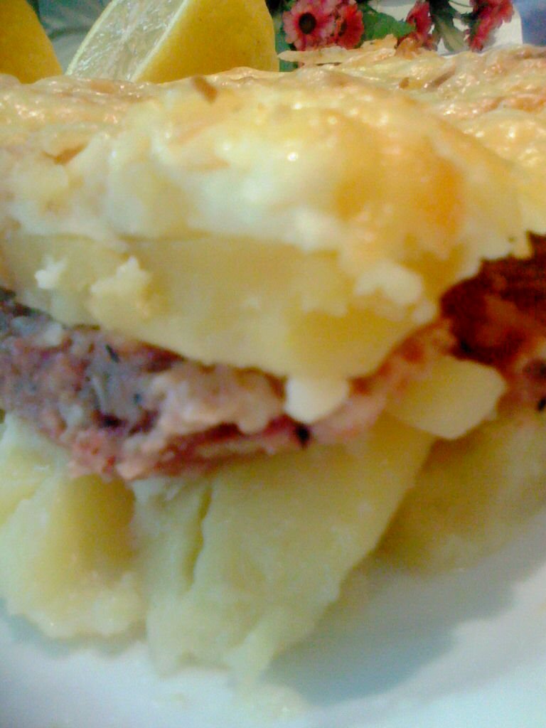 Разстиламе омесената кайма и слагаме останалите картофи отгоре.Запичаме на 200- 220 градуса .Когато е готово го заливаме със заливката .Пак запичаме малко и стържем кашкавал отгоре .Запича се наново до зачервяване.