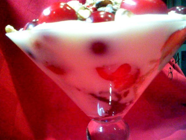 В дълбока купа нареждам от всички плодове сипвам от сметановата смес като хубаво се старая да влезне между плодовете.