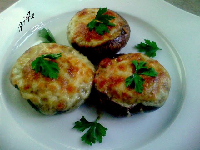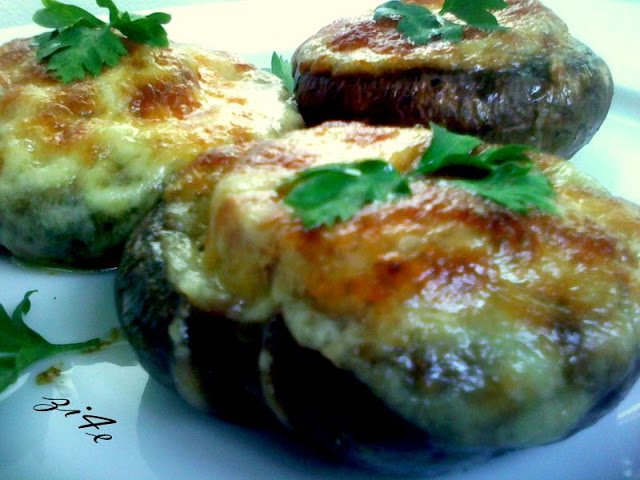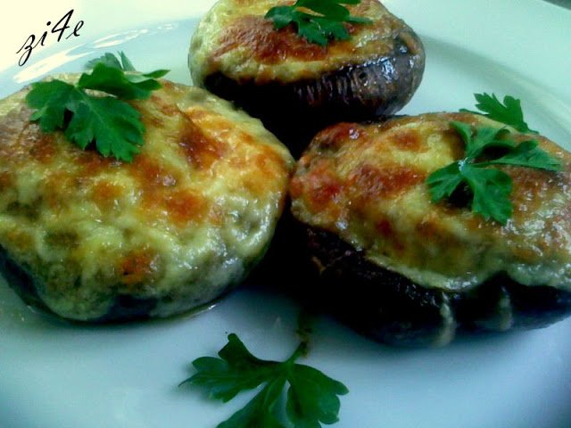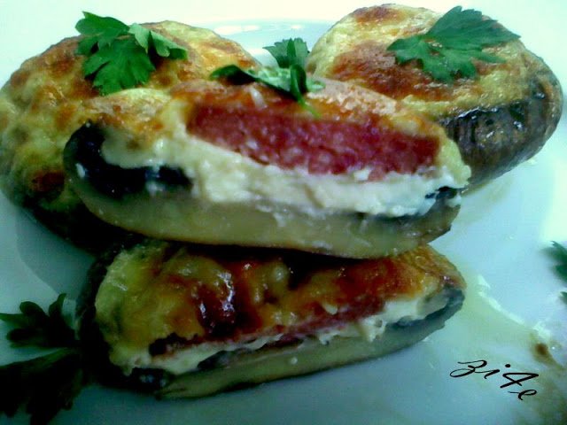 Пълнени гъби с топено сирене, колбас и кашкавал.