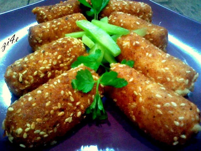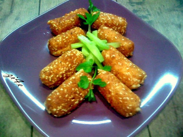 Извадих цилиндрите от сирене ,всяко потапям в разбитото яйце, а след това овалях в сместа от галета и сусам.