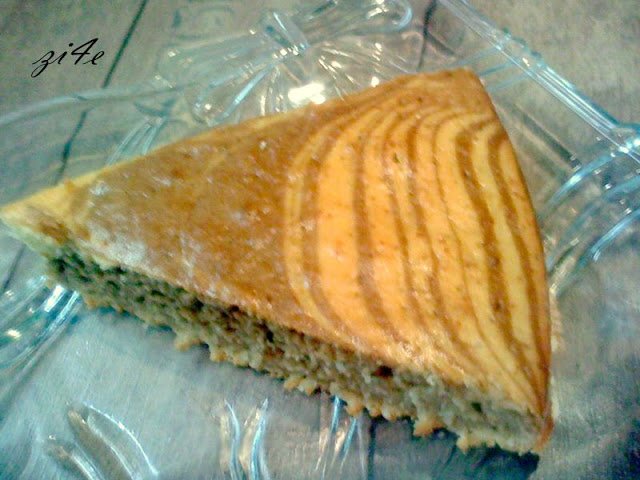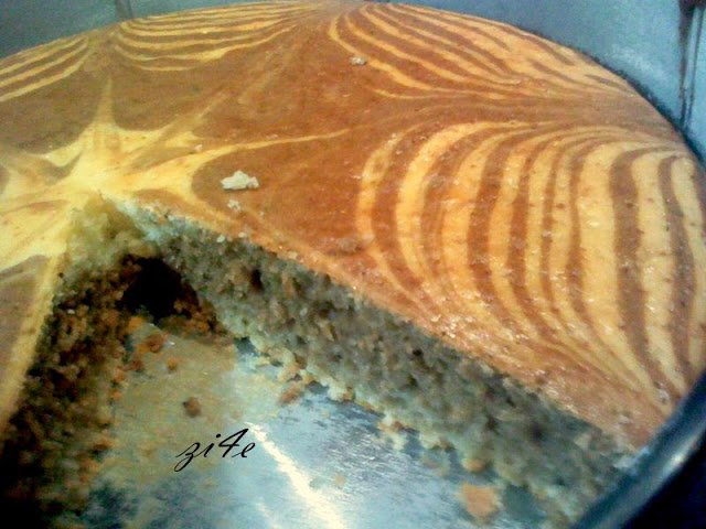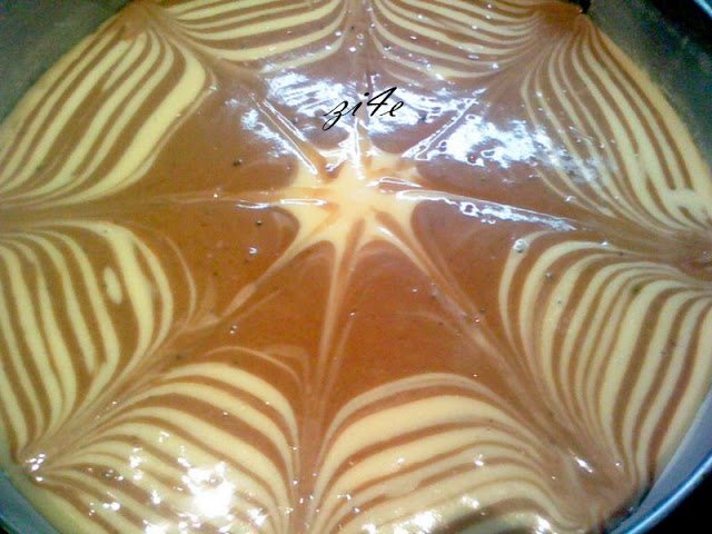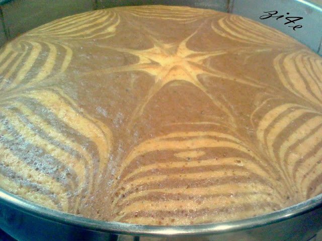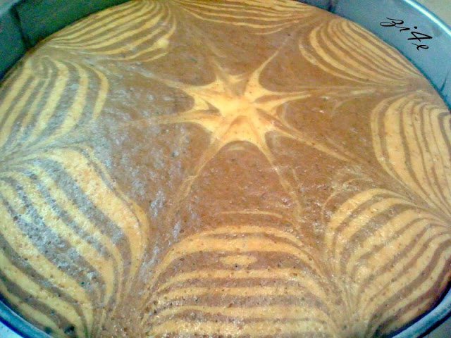 Изсипваме върху него в средата от шоколаденият цвят,и така последователно, ту бялата ,ту тъмната смес и се получават кръгове .