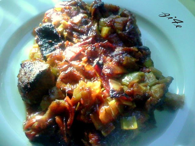 Празът се нарязва на едри кръгчета и също се запържва в съда, докато омекне, заедно с наситнения чесън.