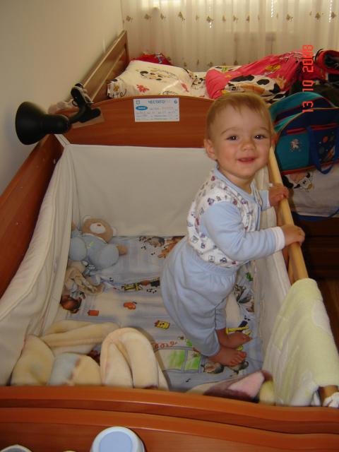 - честно казано не знам дали може от легнало да сяда. Той постоянно е на педал, ходи /придържайки се за мебелите/, обикаля, пълзи, бута, сега му е мерак да влезе във WC-то, ама пусто все под носа му затварям и се започва сърдене. Другата пакост, която му е любима да рови в саксията пръстта и да похапва