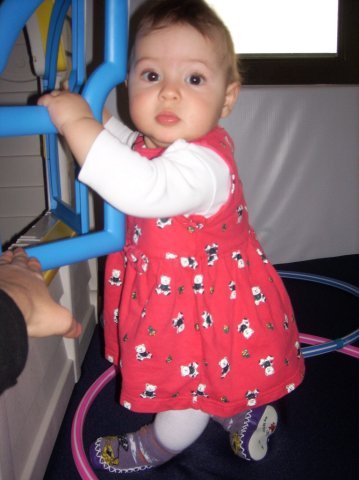Ния вече се изправя на крачета, но като и омръзне ги подвива. Затова избягвам да я слагам в креватчето, за да не си изкриви крачетата. Предпочитам да пълзи по пода.