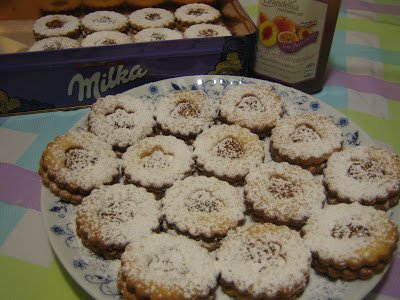 Linzer Augen слепени с конфитюр от праскови и маракуя. Направо прелест.