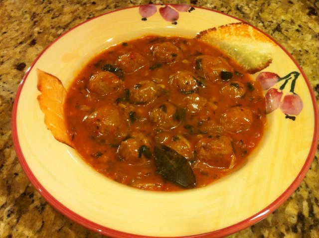 Лукът се задушава с доматения сос и настъргания чесън.Добавя се брашното и червения и черния пипер,и най накрая се добавят топченцата от овкусената с подправки кайма. Долива се водичка,слага се дафиновия лист и чубрицата,и се оставя  да ври докато се сгъсти , И най накрая магданоз Simple Smile