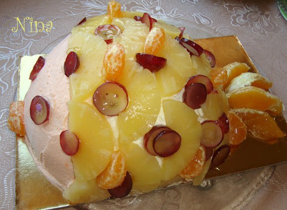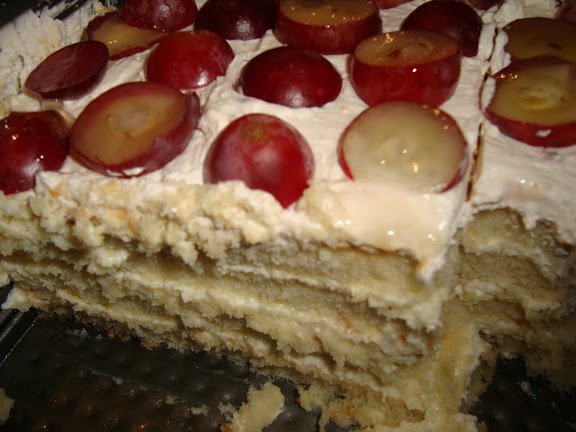 Сладкиш, който реших, че не може да не е украсен и го направих на риба (няма да ви казвам колко ми се подиграваха роднините... казаха, че е шапка  Mr. Green). На следващия ден носих същия сладкиш в работата и само тази снимка успях да направя, докато колежките се сражаваха с лъжици и вилици около мен  Laughing И двете са на основата на заквасена сметана, но има и маскарпоне, течна сметана.... (каквото имах в хладилника) + ананас - сок и плод, ядки, грозде. Невероятно вкусен, наистина.