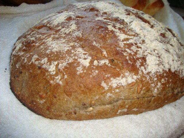 Дано да има с какво да се похваля  Blush Иначе втория ми опит стана по-добре, извадих хляба веднага като изпищя, че е готов, извадих от формата и след това завих и прибрах в торба- доволна съм, че кората не стана толкова твърда и дебела, но има още какво да се желае  Rolling Eyes