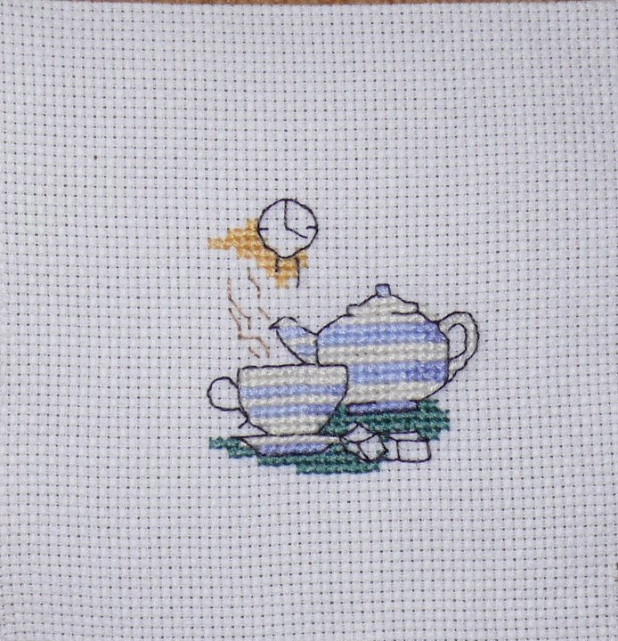 Дойде ми идея вчера да направя нещо такова за един ценител на чая, но ми стои малко незавършено така. По схема в горния десен ъгъл пише ''Tea time", но бъдещия собственик изобщо не харесва латинските надписи, а пък "Време за чай" няма как да го събера, огромно стои до малките чашка и каничка  Outta Joint  Някаква идея какво да напиша или да го оставя така? Предвидила съм да е в малка кръгла рамчица.