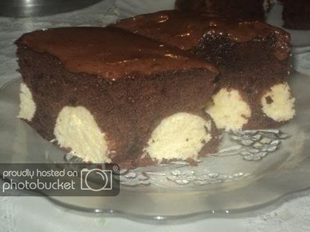 Не се сещам точните мерки на продуктите,но  върху  разбити мляко и яйца се сипва кексово тесто, пече се и се обръща.