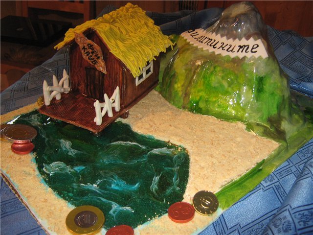 Тортата е подарък от приятелката му като изискванията бяха да има планина със надпис Филипините/вместо Филиповци/къща със провиснала табела ФЕН КЛУБ/което било символа на фен клуба му от приятелки които се разпадат/вода,пясък и пари/като символ да не ги хвърля вече по гаджета/.Проблема които се получи е че правих къщата предварително по шаблон и хич не прецених големината и.Голямичка идва за цялата картина,и водата  която трябваше да е на цялата подложка, но не ми стигна кристалината и за да не стои като отядено сложих този пясък които стана като рамка и страшно ме дразни.Но каквото такова.Ето я: