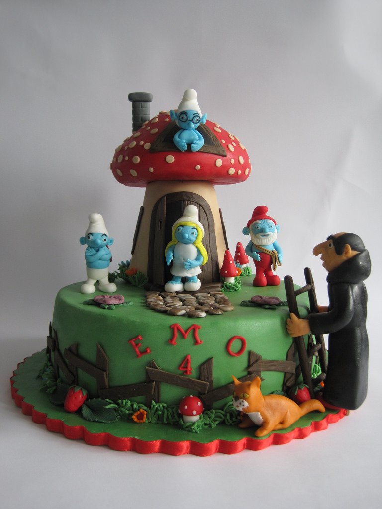 Тази торта я подготвям от 3 седмици-всеки един свободен миг се занимавах с нея.Направата и ми костваше 19ч.30м.-Вал не се смей ,че засичам,ама аз един смърф правя за 1ч.,пък и като съм на работа времето ми е кът.Тортата е какаови блатове,с баварски домашен  крем с парченца нат.шоколад и бишкоти.Направата на гъбата ми костваше само 5ч. и тежеше около 1кг,а уж е от оризон.Самата торта тежеше 6кг.Този път и аз се постарах и подложката покрих и фона е картон,та и панделка и сложих.На рожденният ден за който я правих обаче за малко да са само 2 деца,че всички се натръшкали от грипа,но бяха поканени още 2 в последният момент.Голяма разправия падна за кое дете коя фигурка да е,добре,че не бяха много децата Wink.Най-кофтито за мене беше,че ме накараха аз да срежа тортата,а като знам колко труд съм вложила...ми се ревеше ooooh!Бързам да я пусна,защото Вал тези дни има рожденничка и ще ни засенчи всичките Heart EyesМайтапя се, разбира се. HugГлавата на Гаргамел я прави мъжа ми както и котката,защото просто нямах време за всичко.Закрепянето на Гаргамел ми беше много трудно,защото нямаше място на подложката и съм го забола с клечки в китките ,за да не падне.Едивственно не ми остана време да сложа панти на вратата от първоначалният план и исках името на детето да е в кръгчета или звезди ,но не остана място.