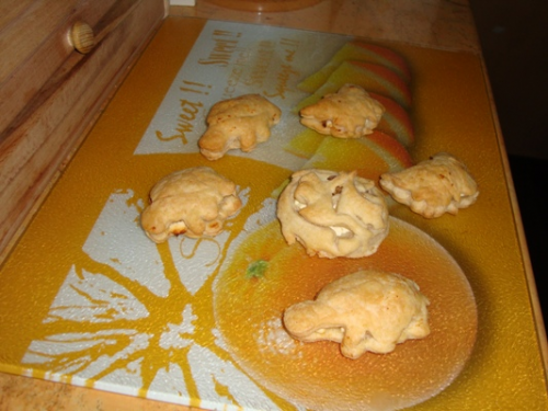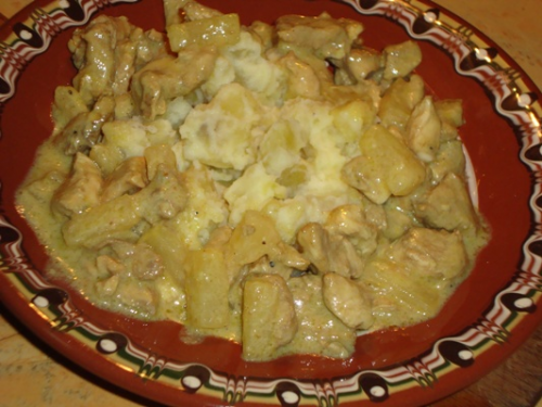 пиле с ананас /по Пепи /, много ни хареса с варени картофи със сметана, супа с домашен пилешки бульон и зелев сок, бутерки с готово тесто.